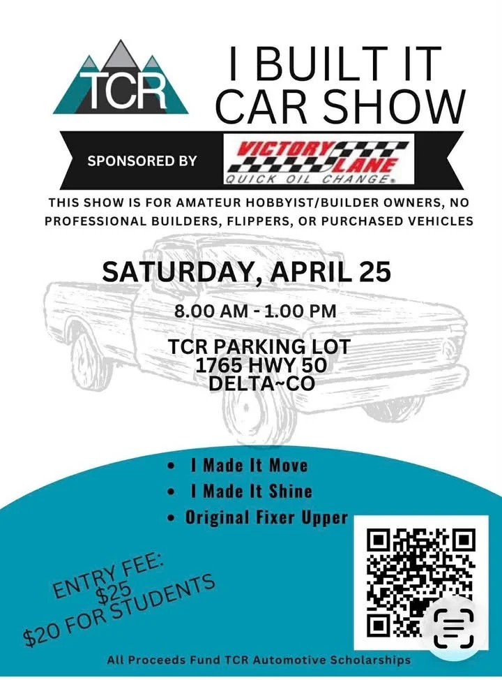Back to All Events I Built It Car Show Saturday, April 25, 2026 8:00 AM 1:00 PM Technical College of the Rockies 1765 U.S. 50 Delta, CO, 81416 United States (map) Google Calendar ICS RegistrationFacebook
